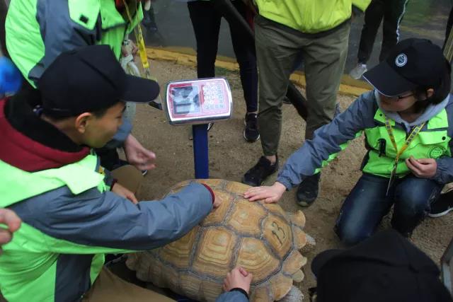 同学们给苏卡达象龟称重